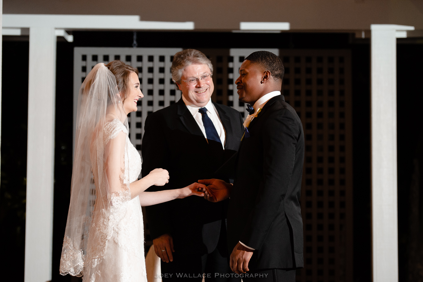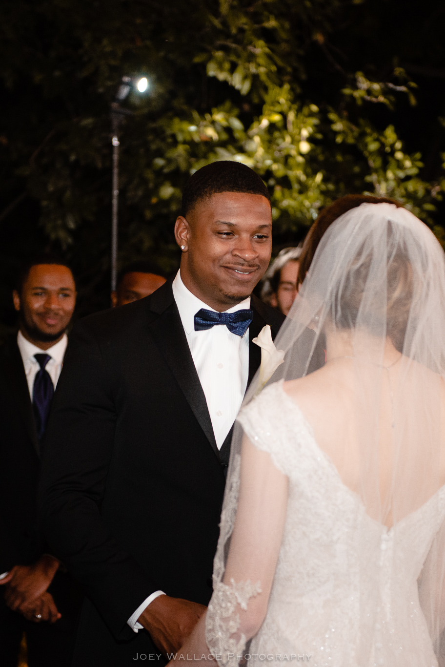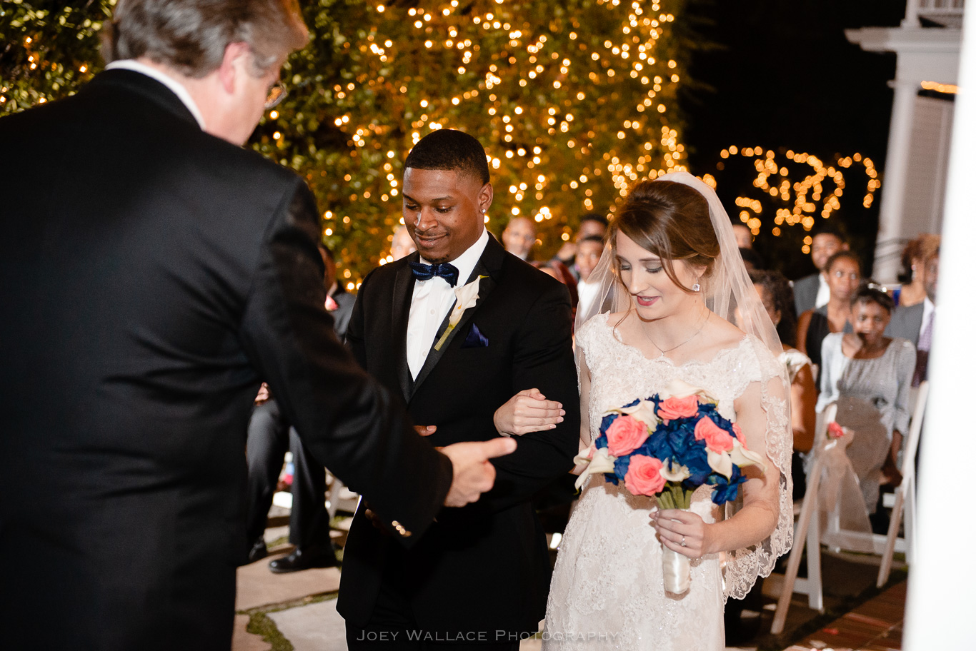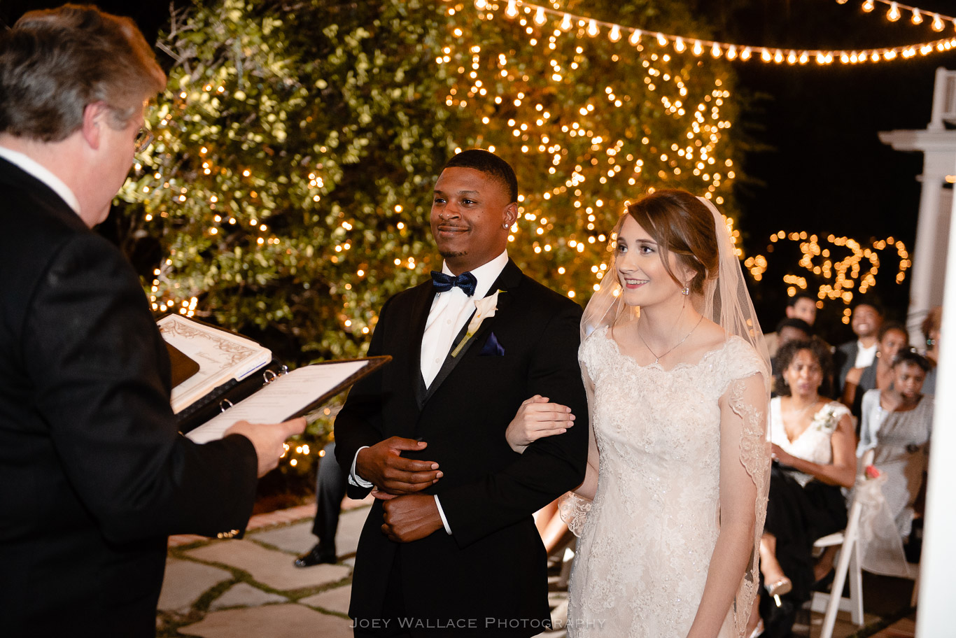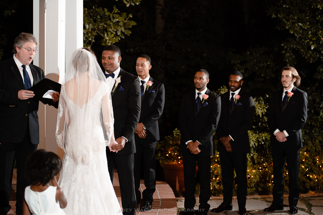The couple arrived at the vintage house late in the afternoon, shortly after that they began to get ready for their night ceremony at the Flint Hill. The bridal party shared laughter, drinks, and chicken nuggets before they got into their formal dresses and were ushered down the aisle as our Atlanta Wedding Photographers were prepared to flawlessly capture the interracial wedding, despite the venue’s intimate dark setting, thanks to our advanced wireless lighting system.