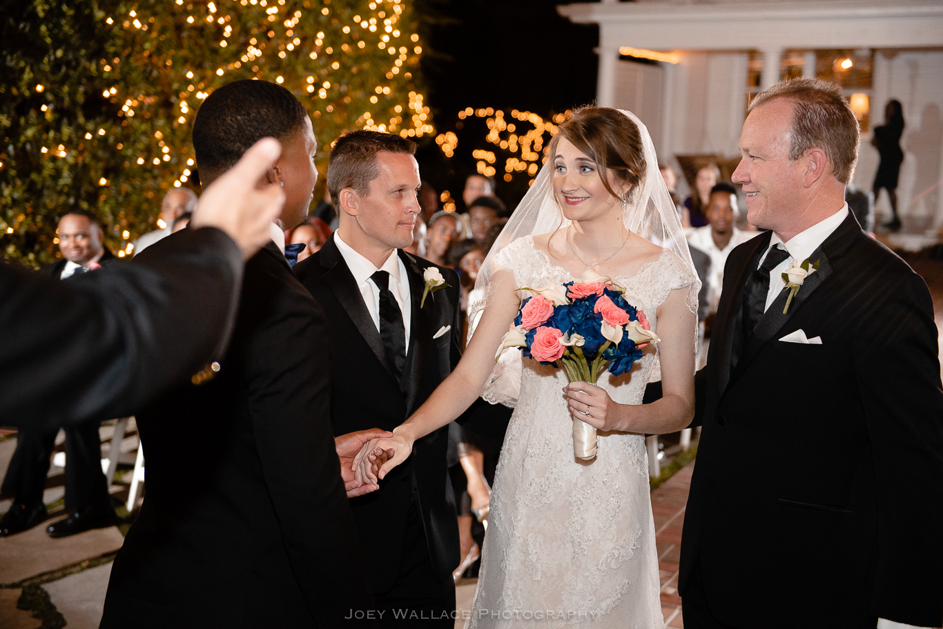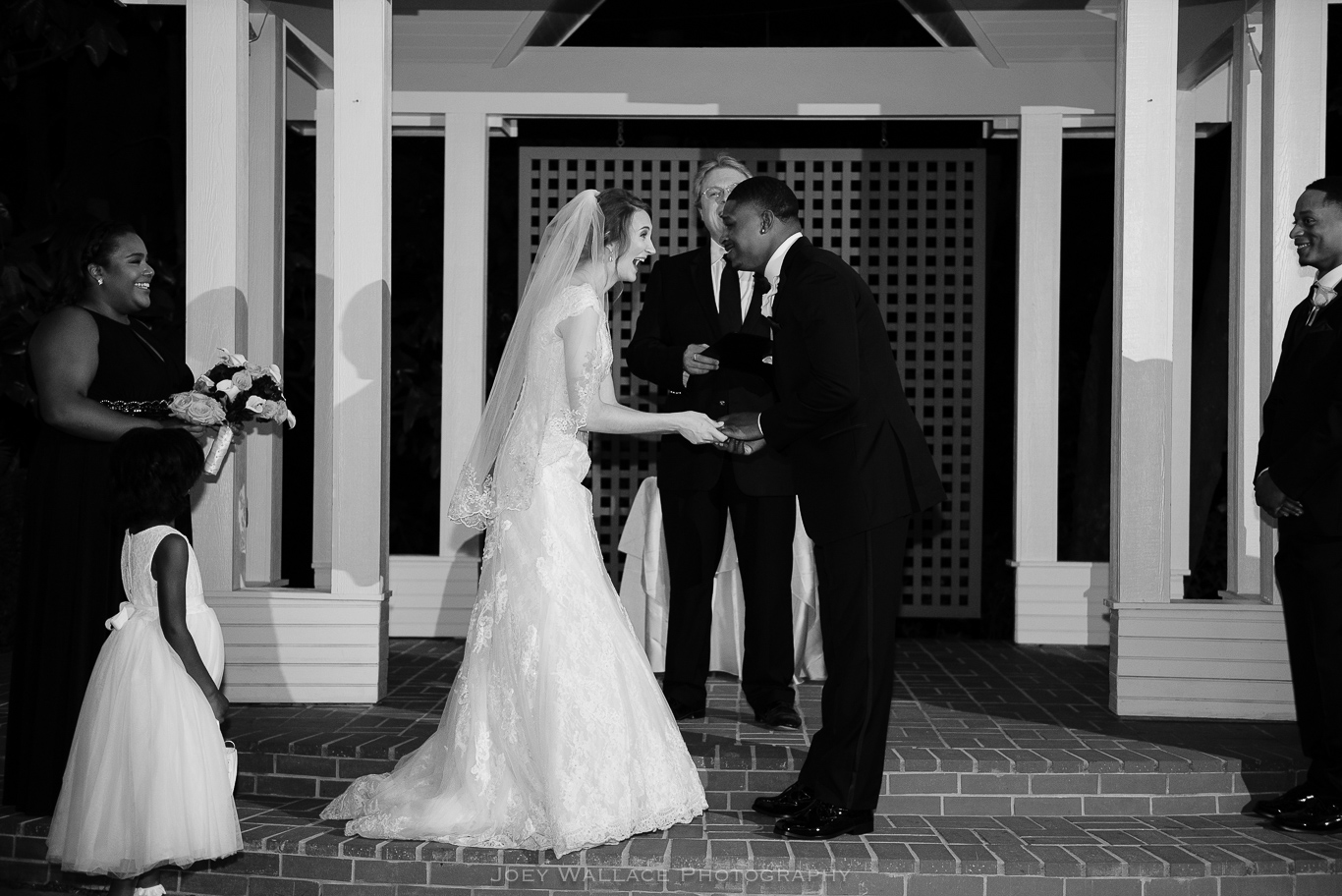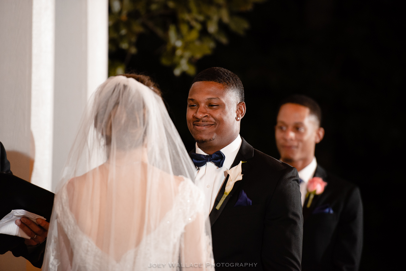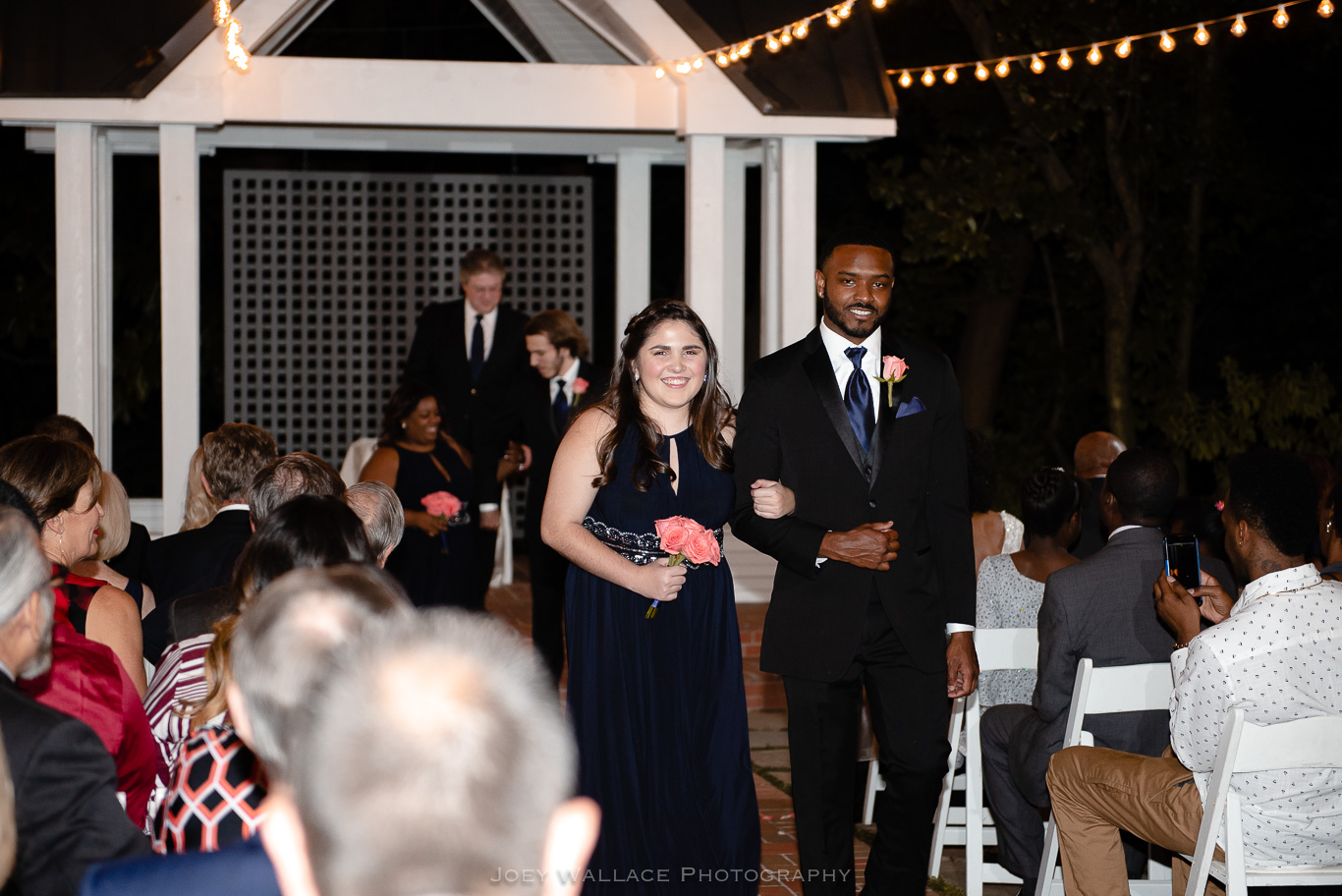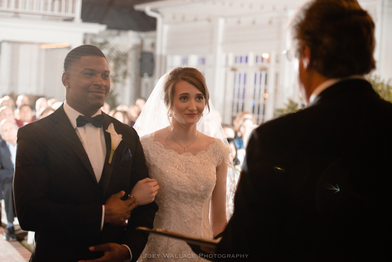 The couple arrived at the vintage house late in the afternoon, shortly after that they began to get ready for their night ceremony at the Flint Hill. The bridal party shared laughter, drinks, and chicken nuggets before they got into their formal dresses and were ushered down the aisle as our Atlanta Wedding Photographers were prepared to flawlessly capture the interracial wedding, despite the venue’s intimate dark setting, thanks to our advanced wireless lighting system.