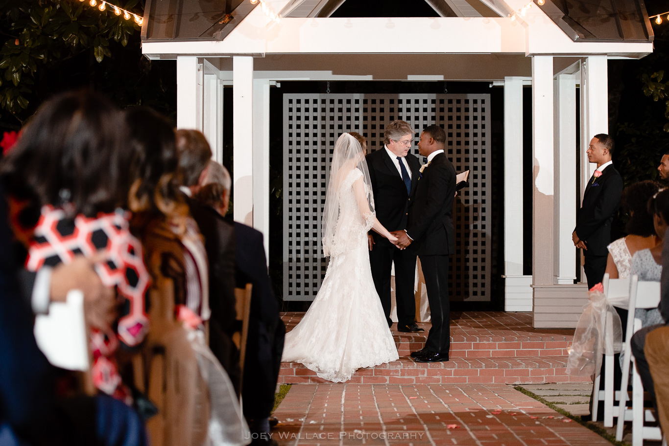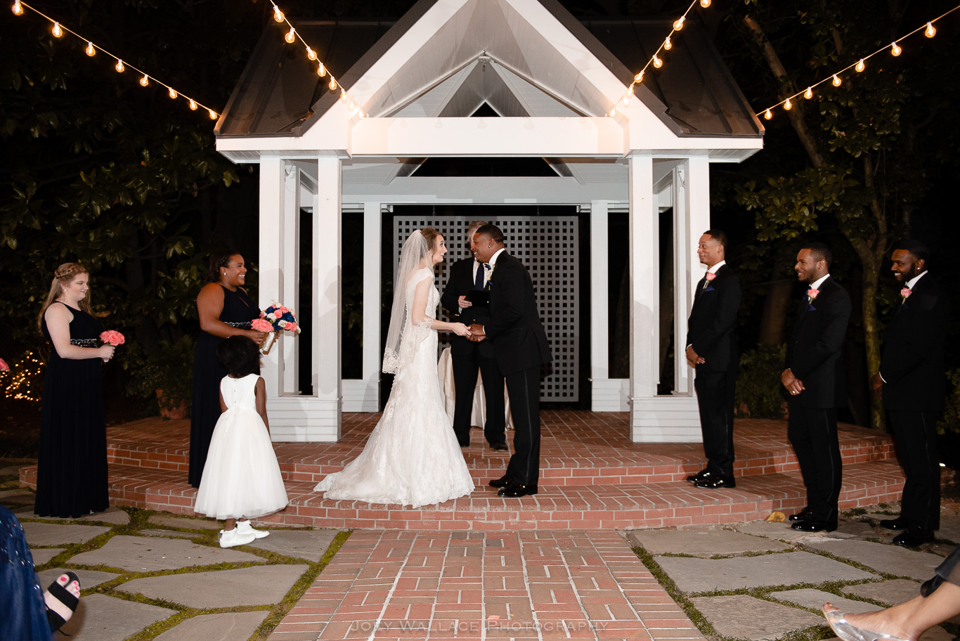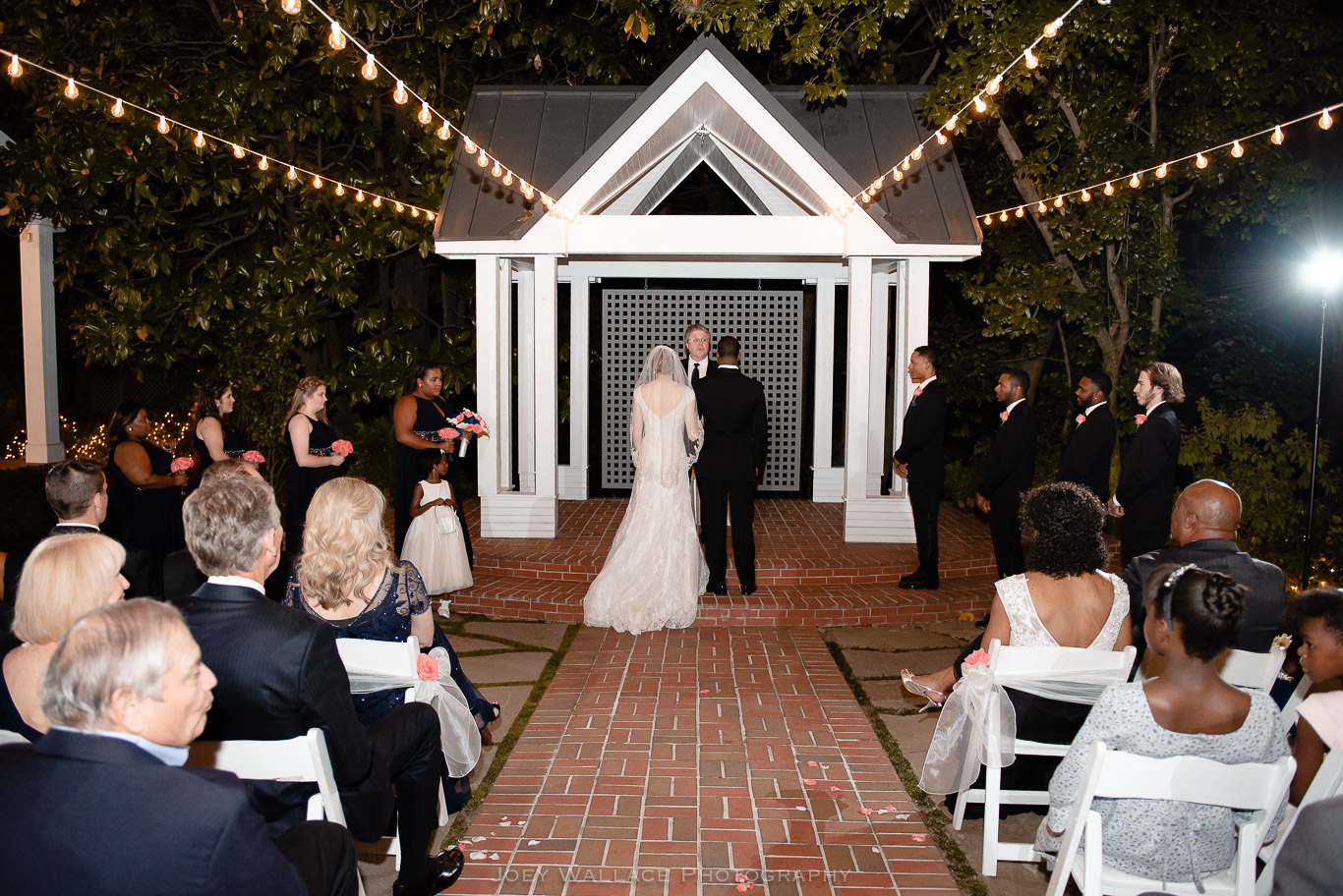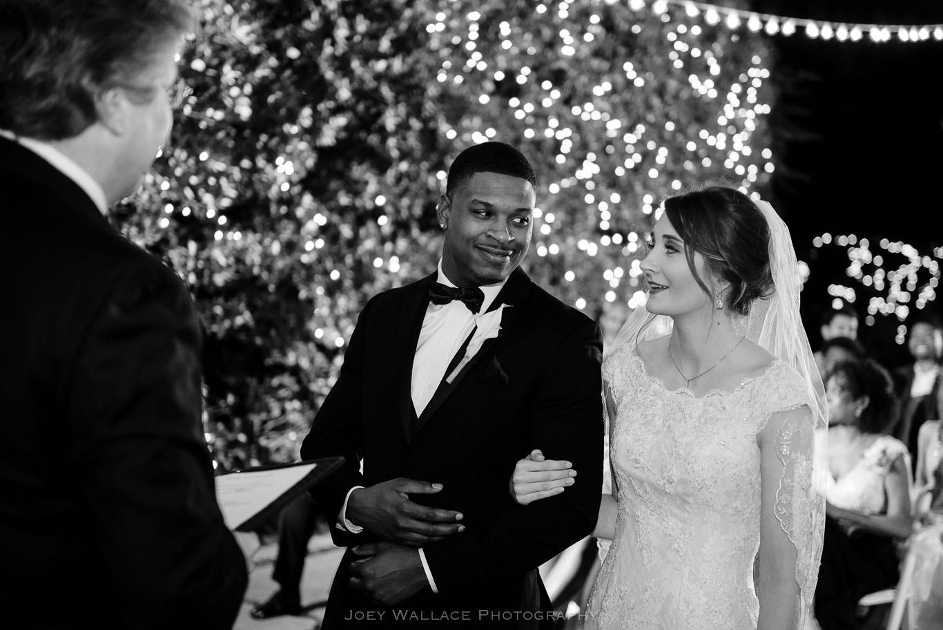 The couple arrived at the vintage house late in the afternoon, shortly after that they began to get ready for their night ceremony at the Flint Hill. The bridal party shared laughter, drinks, and chicken nuggets before they got into their formal dresses and were ushered down the aisle as our Atlanta Wedding Photographers were prepared to flawlessly capture the interracial wedding, despite the venue’s intimate dark setting, thanks to our advanced wireless lighting system.