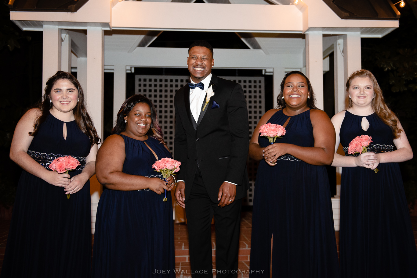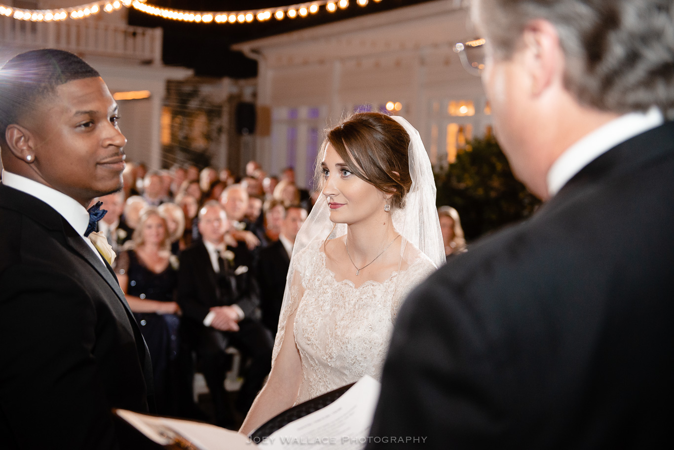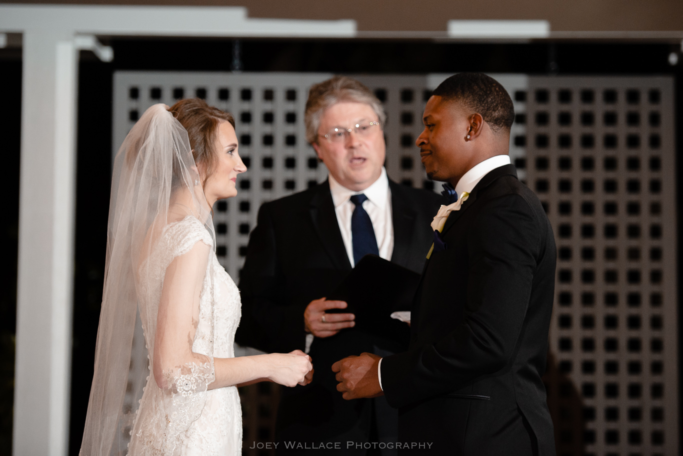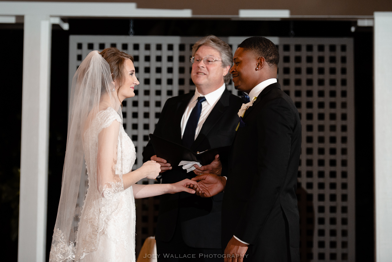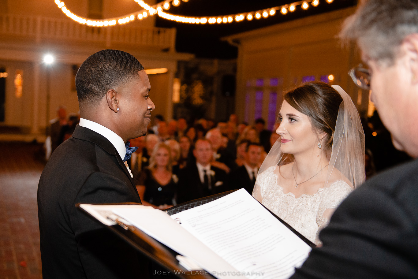 The couple arrived at the vintage house late in the afternoon, shortly after that they began to get ready for their night ceremony at the Flint Hill. The bridal party shared laughter, drinks, and chicken nuggets before they got into their formal dresses and were ushered down the aisle as our Atlanta Wedding Photographers were prepared to flawlessly capture the interracial wedding, despite the venue’s intimate dark setting, thanks to our advanced wireless lighting system.