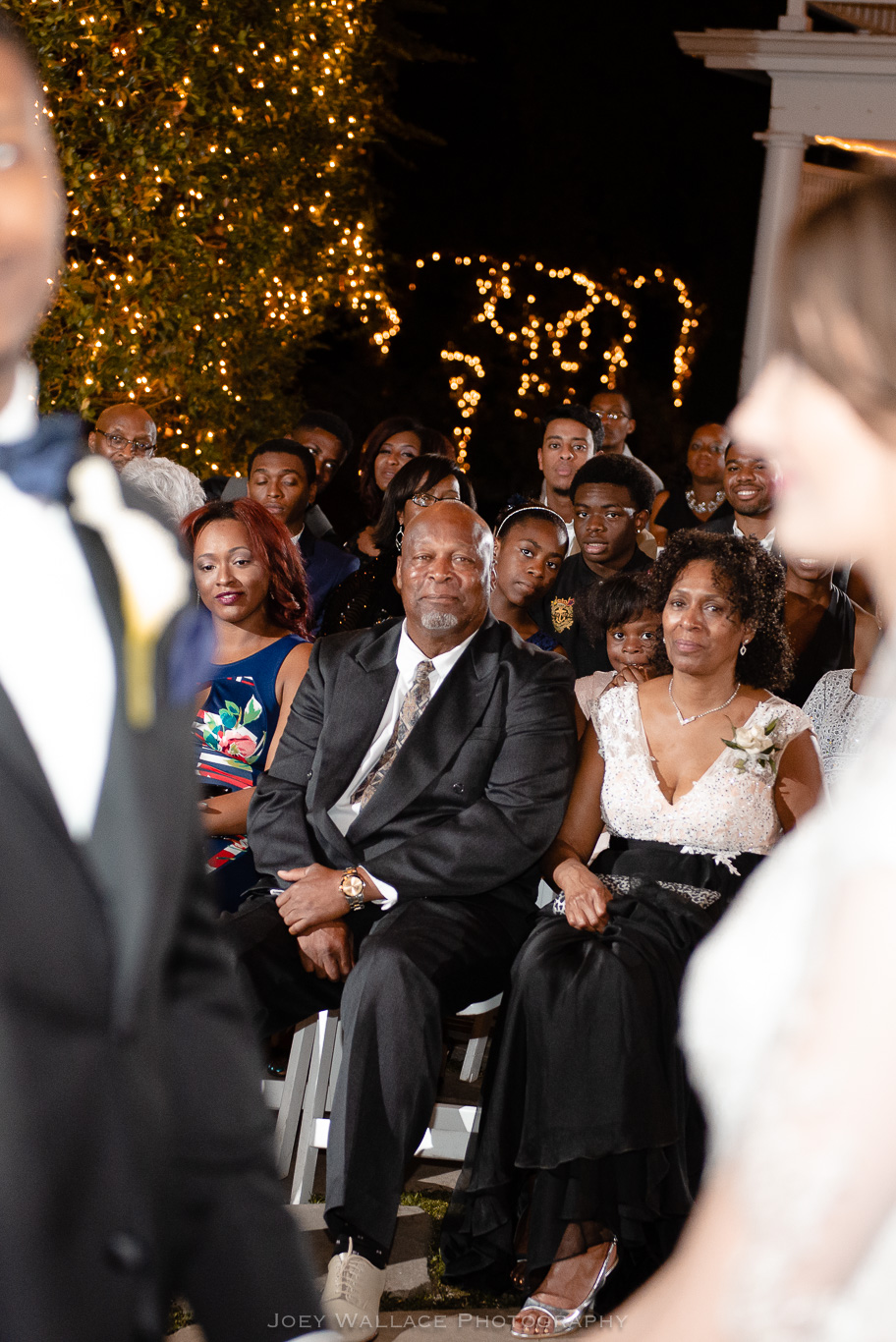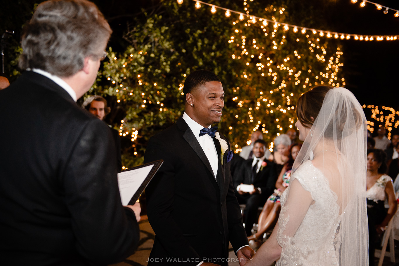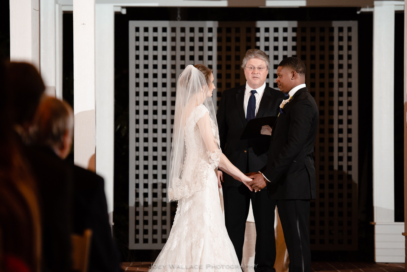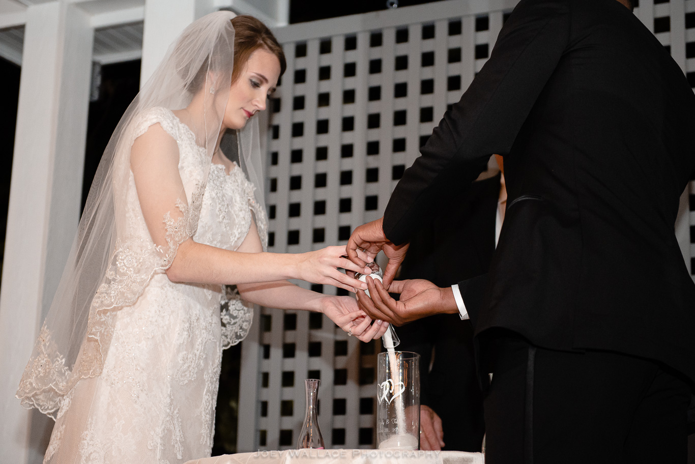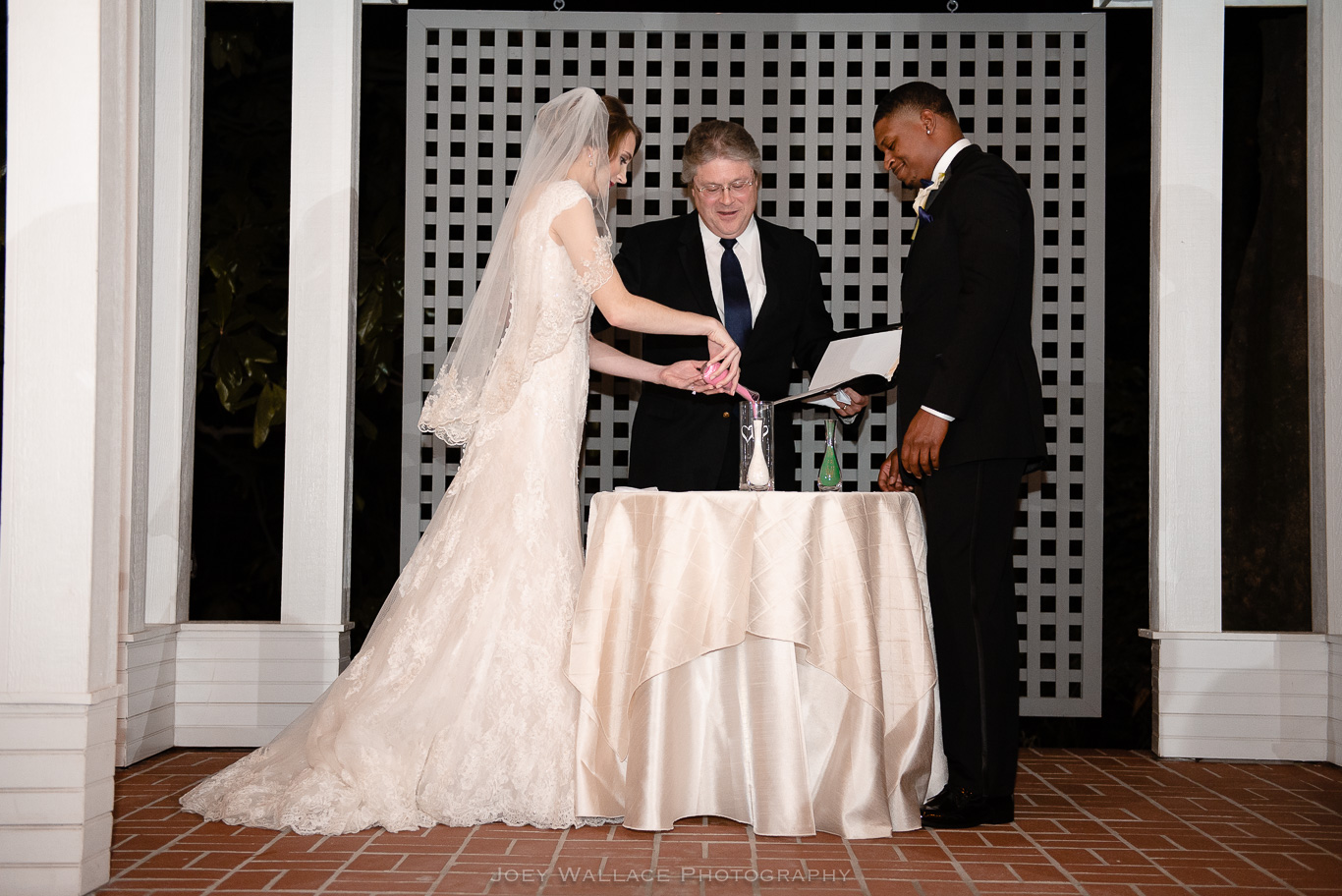 The couple arrived at the vintage house late in the afternoon, shortly after that they began to get ready for their night ceremony at the Flint Hill. The bridal party shared laughter, drinks, and chicken nuggets before they got into their formal dresses and were ushered down the aisle as our Atlanta Wedding Photographers were prepared to flawlessly capture the interracial wedding, despite the venue’s intimate dark setting, thanks to our advanced wireless lighting system.