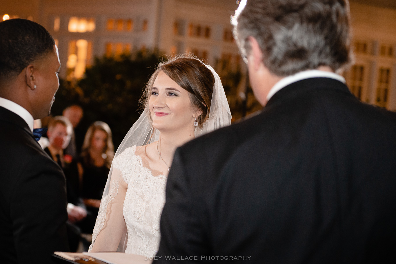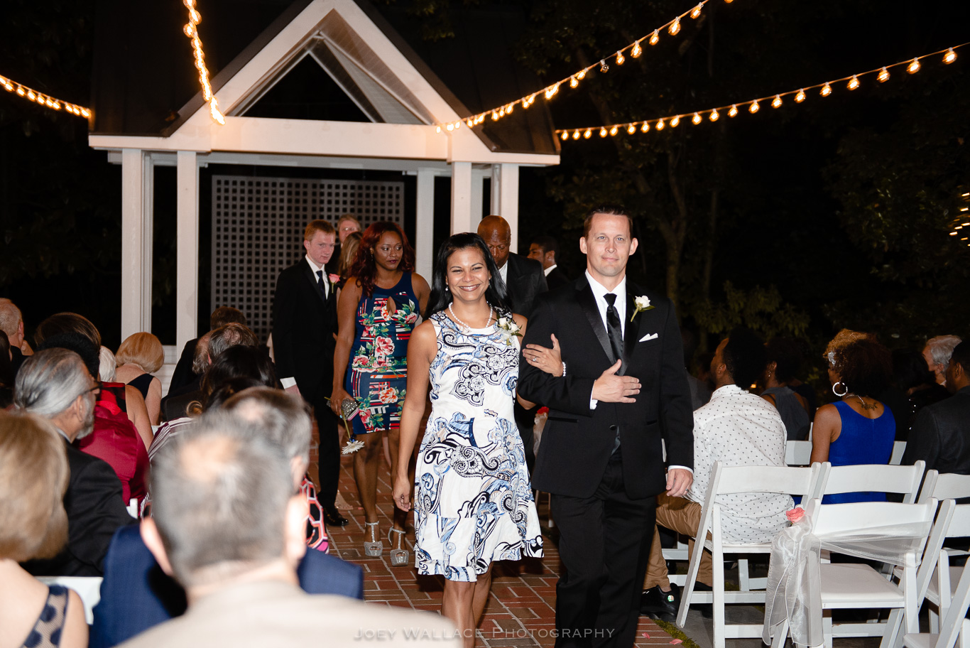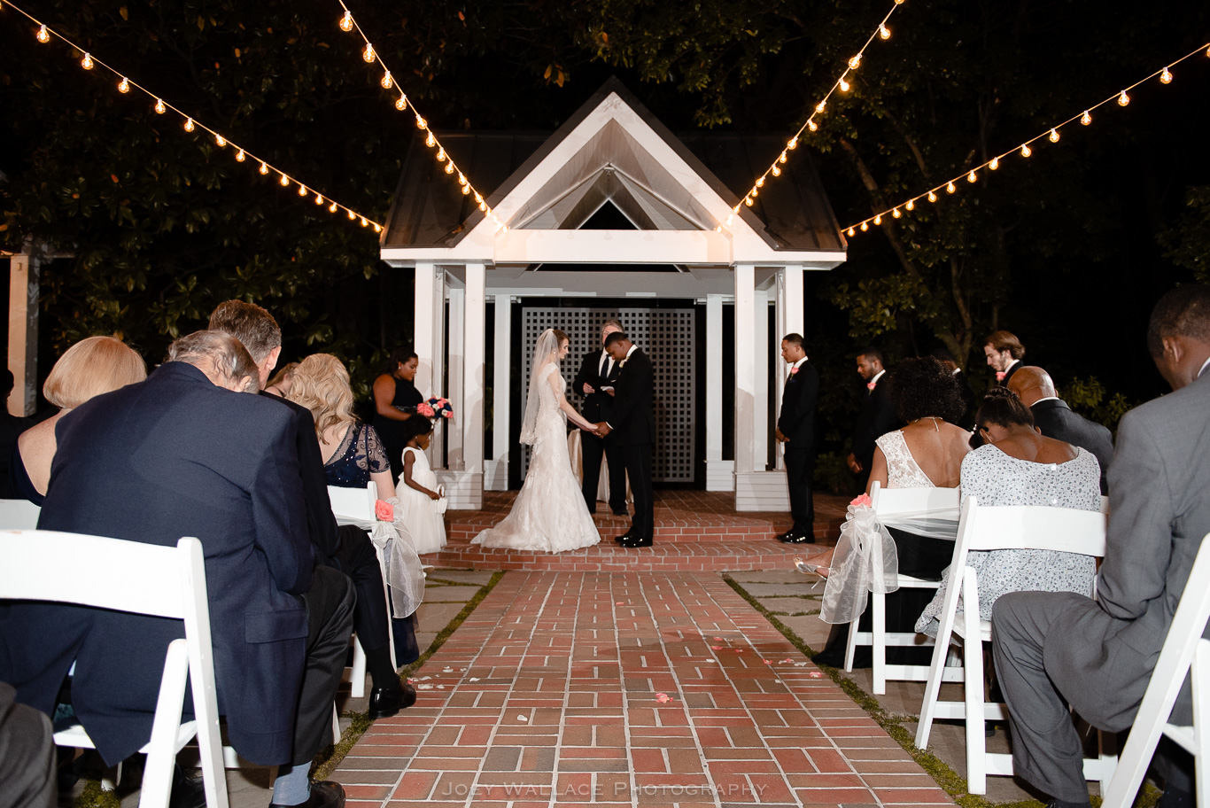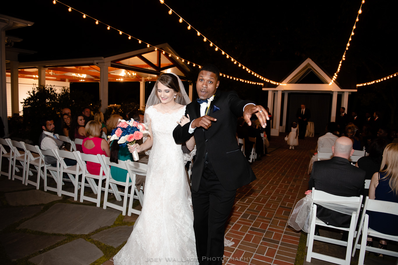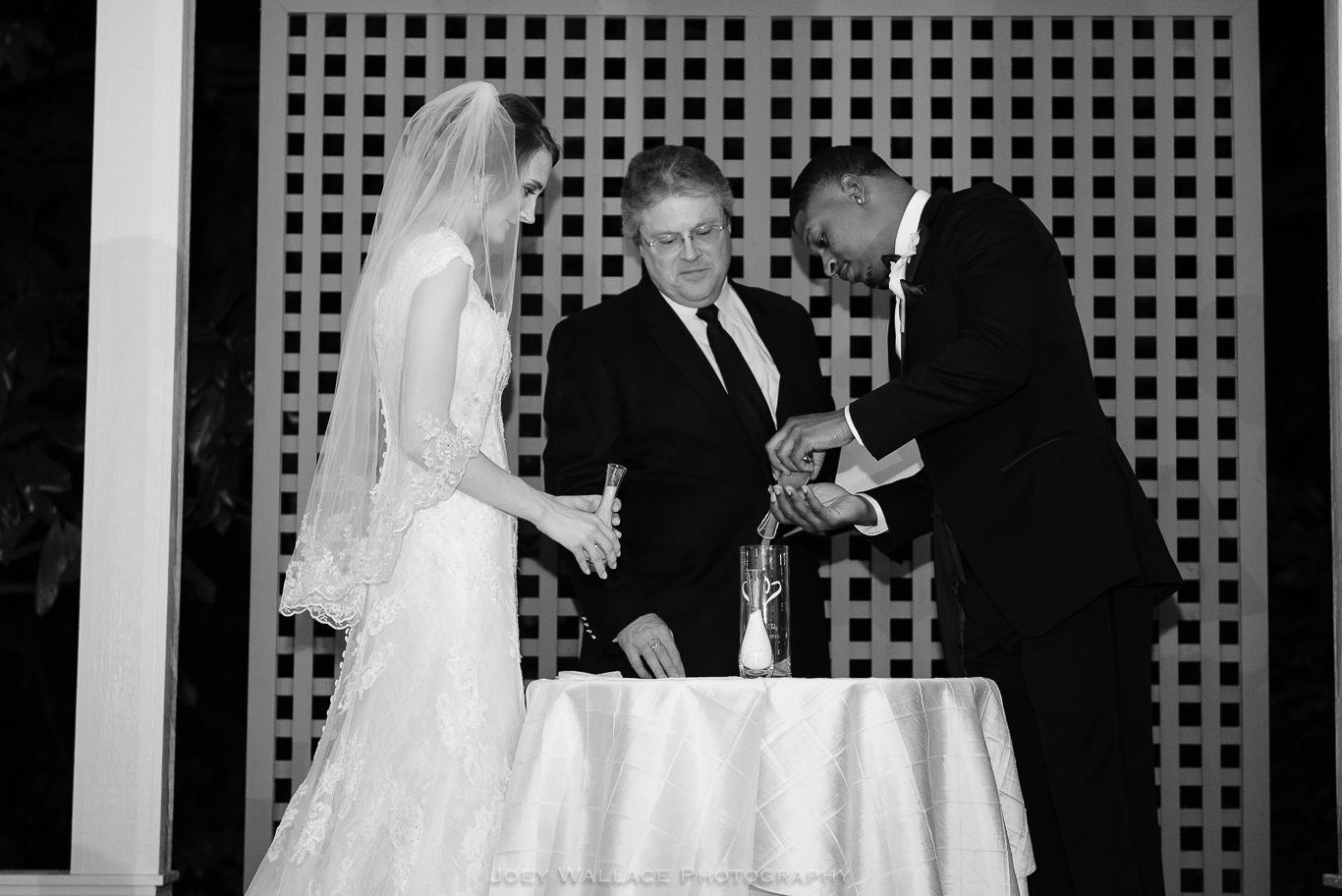 The couple arrived at the vintage house late in the afternoon, shortly after that they began to get ready for their night ceremony at the Flint Hill. The bridal party shared laughter, drinks, and chicken nuggets before they got into their formal dresses and were ushered down the aisle as our Atlanta Wedding Photographers were prepared to flawlessly capture the interracial wedding, despite the venue’s intimate dark setting, thanks to our advanced wireless lighting system.