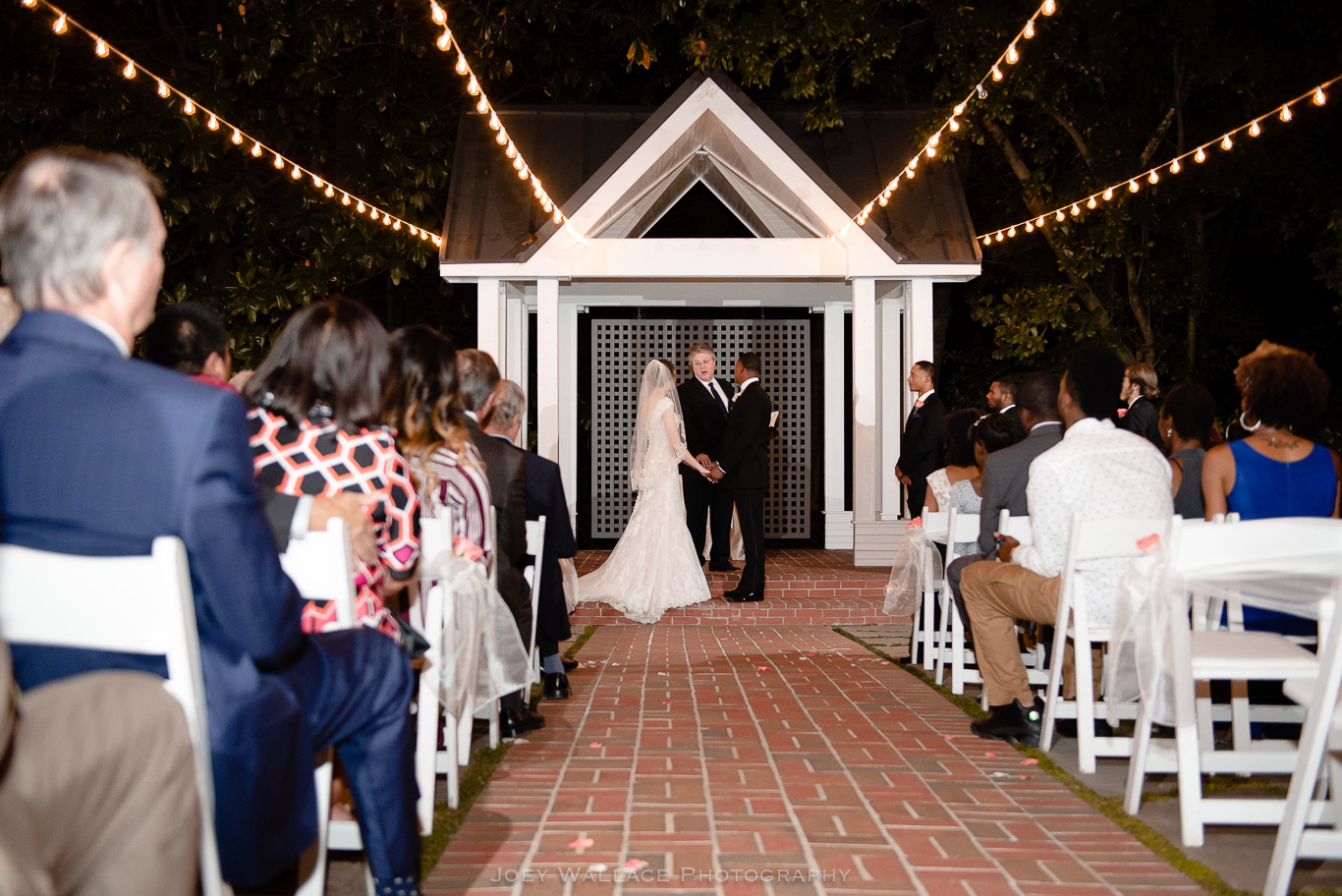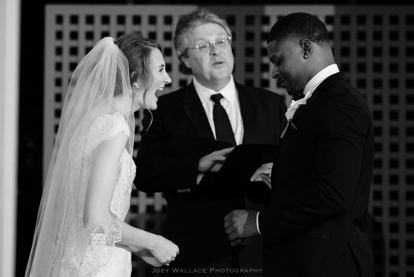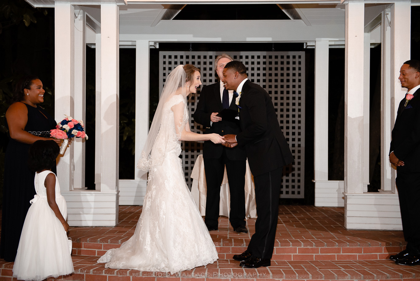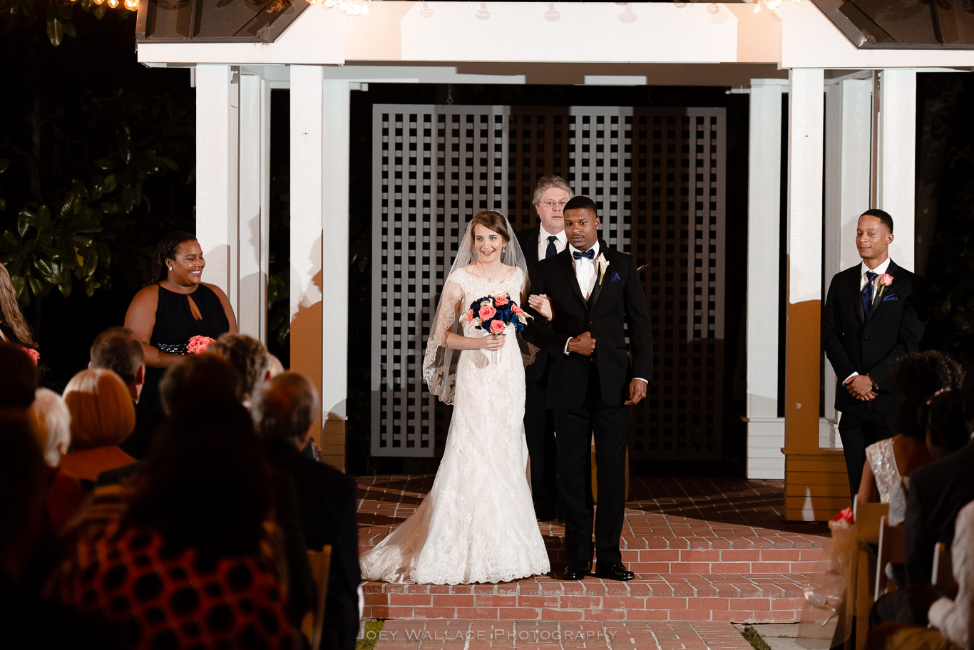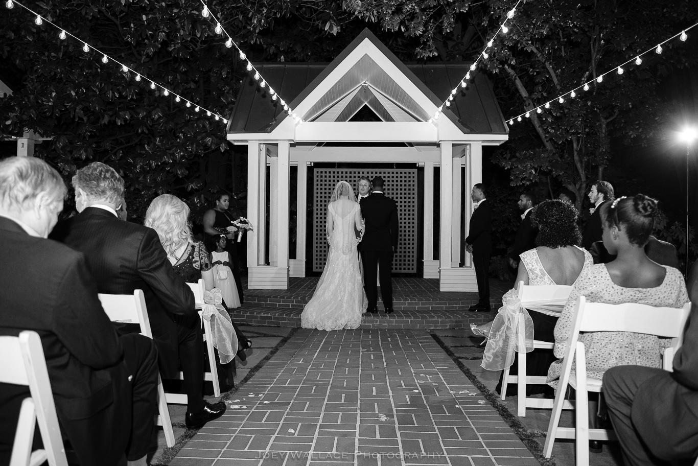 The couple arrived at the vintage house late in the afternoon, shortly after that they began to get ready for their night ceremony at the Flint Hill. The bridal party shared laughter, drinks, and chicken nuggets before they got into their formal dresses and were ushered down the aisle as our Atlanta Wedding Photographers were prepared to flawlessly capture the interracial wedding, despite the venue’s intimate dark setting, thanks to our advanced wireless lighting system.